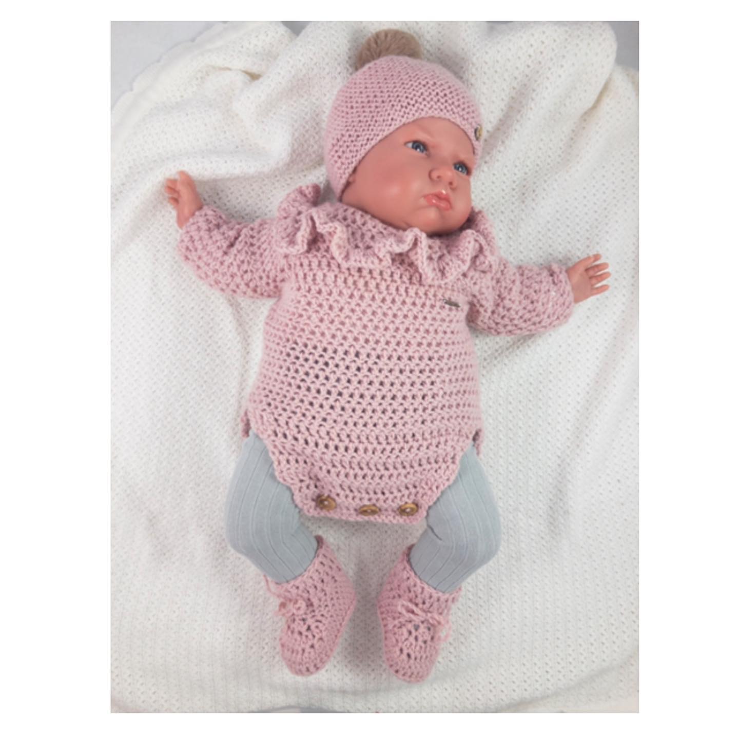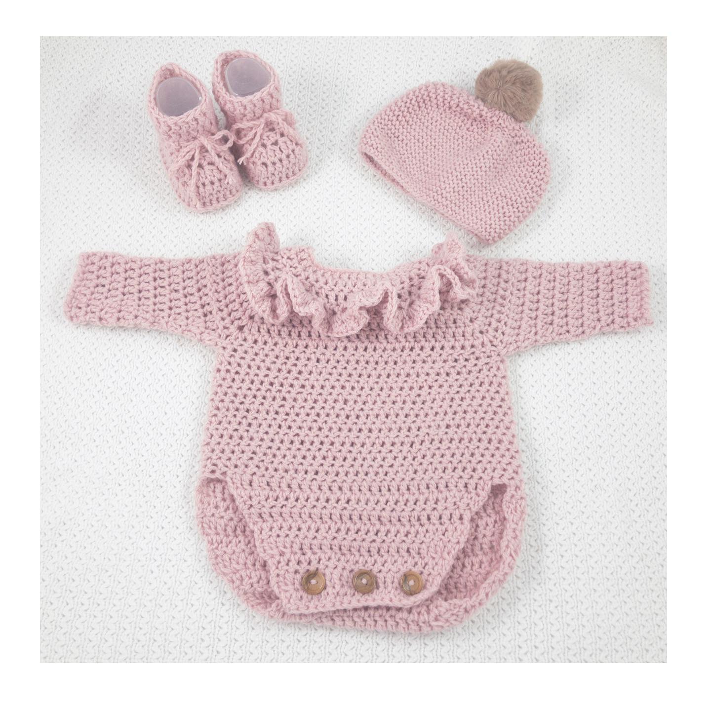 Pelele tejido a mano con delicados volantes, suave, cómodo y perfecto para las primeras puestas.