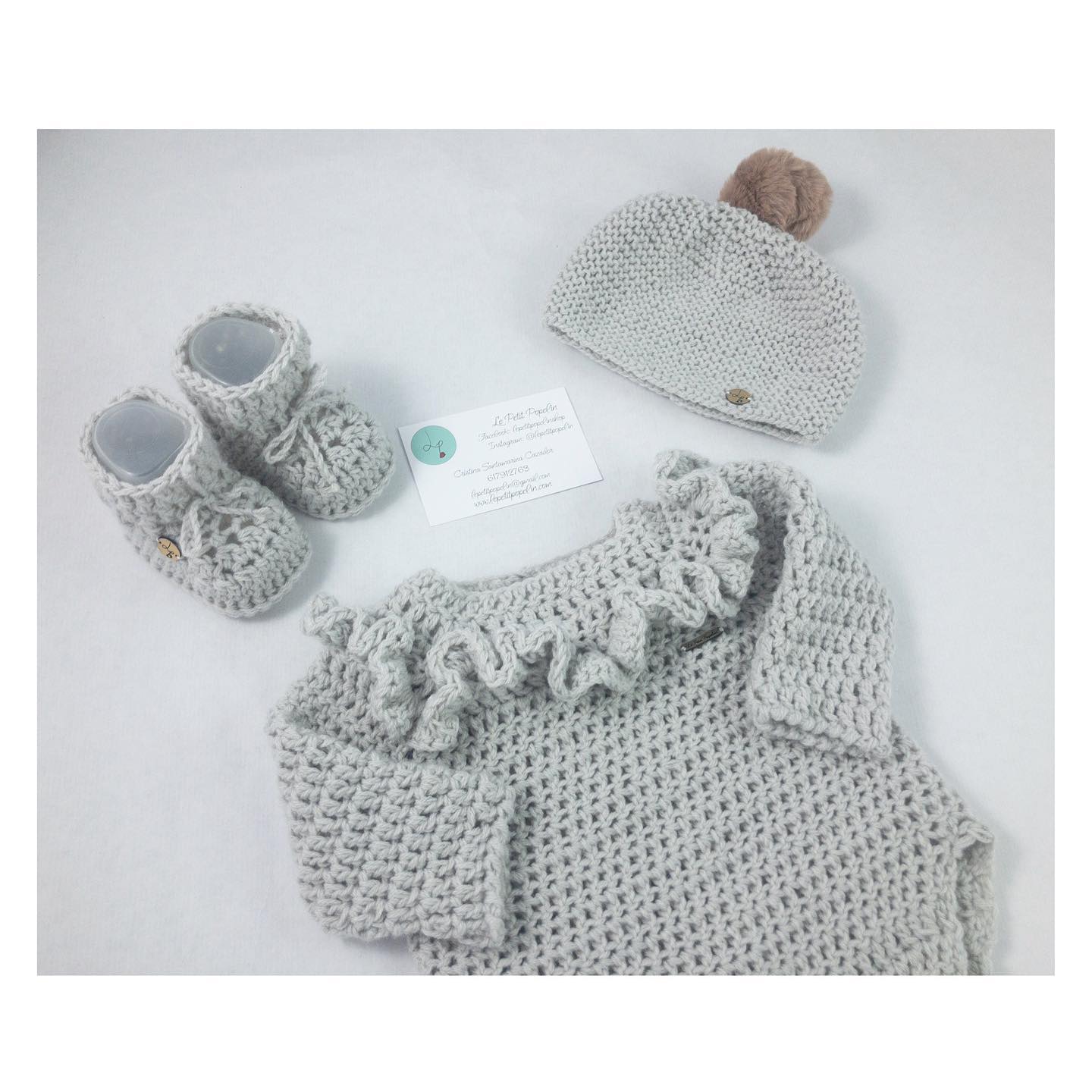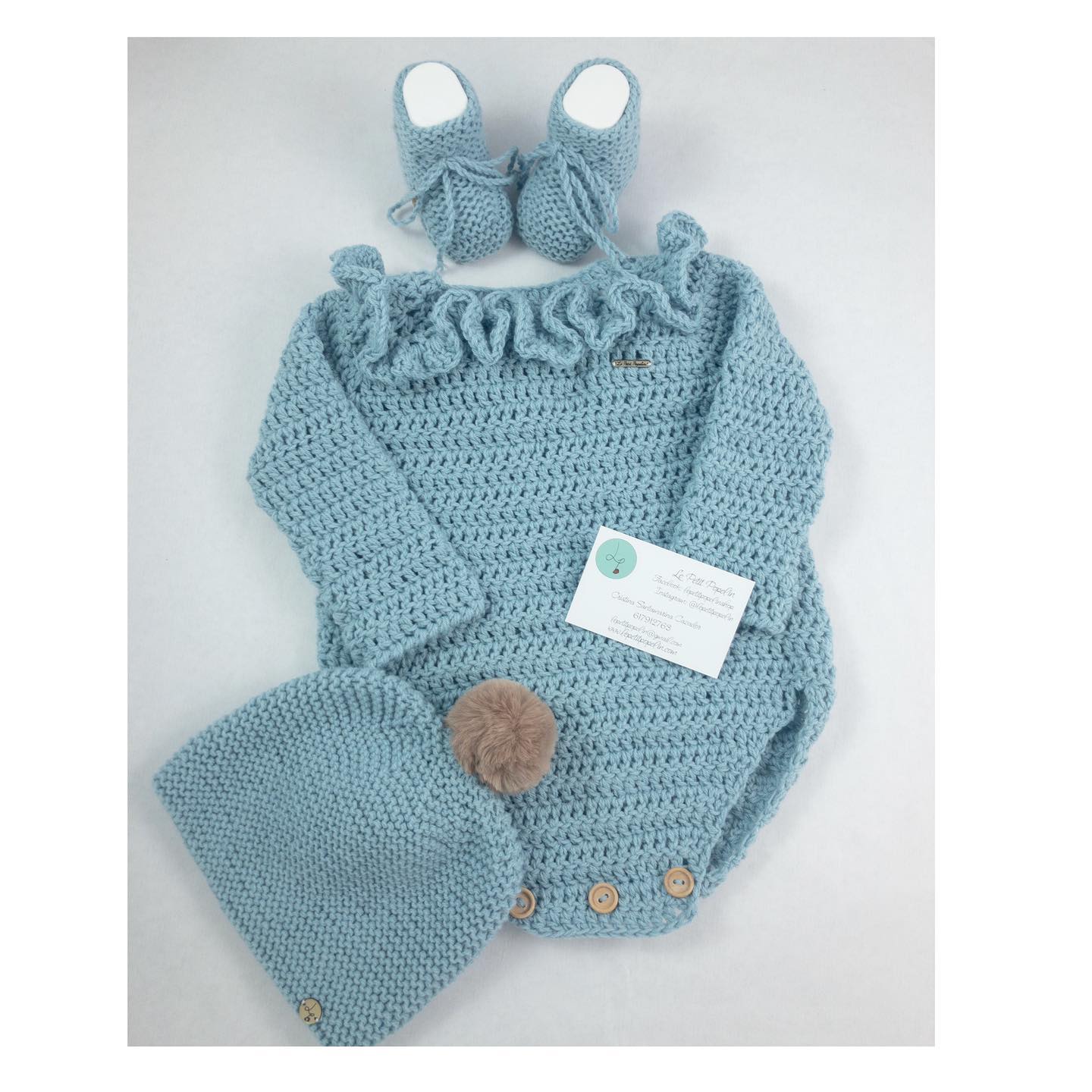 El Pelele Volantes es una de las piezas más especiales de Le Petit Popelin. Está tejido completamente a mano, con una textura suave y envolvente que cuida la piel del bebé desde el primer día.